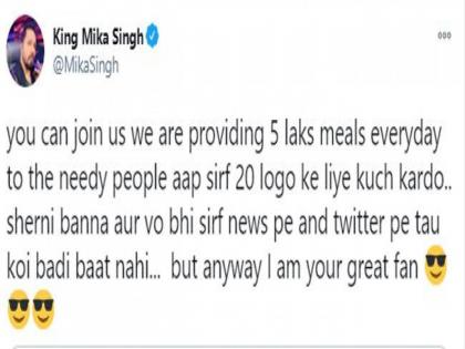 मीकाने आणखी एका ट्विटमधून कंगना रनौतला वायफळ बडबड करण्याऐवजी काही चांगलं काम करण्याचा सल्ला दिला आहे. मीकानुसार, त्याची टीम रोज ५ लाख लोकांना जेवण पुरवत आहे. तो म्हणाला की, जर कंगनाने २० लोकांनाही जेवण दिलं तरी मोठी गोष्ट होईल. मीका जोर देत म्हणाला की, सोशल मीडियावर शेरनी होणं सोपं आहे, पण तसं काम करणं कठिण.