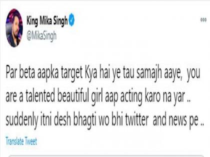 आता गायक मीका सिंहने कंगना रनौतला एक सल्ला दिला आहे. कंगनाकडून सतत सोशल मीडियावर होत असलेल्या सततच्या बयानबाजीमुळे मीका हैराण झाला आहे. त्याच्यानुसार, कंगनाने केवळ आणि केवळ अभिनय करण्याचं काम करावं. याबाबत त्याने लिहिले की, 'बेटा तुझं टार्गेट काय आहे, हे काही समजत नाही. तू खूप हुशार-सुंदर मुलगी आहेस. अभिनय कर ना यार, अचानक इतकी देशभक्ती तीही ट्विटर आणि न्यूजमध्ये'.