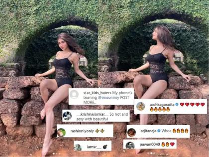 शेअर केलेल्या फोटोत मौनीने ब्लॅक कलरचा बॉडीसूट घातला आहे. जाळीच्या या स्किनफिट आऊटफिटमध्ये मौनीचे स्लिम फिगर हाइलाईट होतेय. हे फोटो पाहून चाहते अक्षरश: तिच्या प्रेमात पडले.