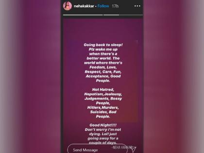 नेहाने इंस्टाग्रामवर सांगितले की, मी पुन्हा शांत झोपण्यासाठी जात आहे. ज्यावेळी जगात सगळे चांगले घडू लागेल तेव्हा मला झोपेतून उठवा. या नव्या जगात जिथे प्रेम, आदर, स्वातंत्र्य, काळजी, मजामस्ती, स्वीकृती आणि चांगली माणसे असतील. या जगात द्वेष, घराणेशाही, मत्सर, जजमेंट्, हिटलर्स, खून, आत्महत्या आणि वाईट माणसे सार्यांना थारा नसेल. काळजी करु नका, मी मरणार नाही आहे, फक्त काही काळासाठी या सगळ्यांपासून लांब जात आहे.