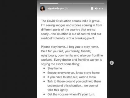 तिने लिहिले, ‘संपूर्ण भारतात कोरोनाची स्थिती गंभीर आहे. देशातील वेगवेगळ्या भागातील फोटो व स्टोरीज पाहतेय. हे चित्र प्रचंड भीतीदायक आहे. स्थिती नियंत्रणाबाहेर आहे. कृपा करून घरात राहा. मी तुमच्यापुढे भीक मागते, कृपा करून घराबाहेर पडू नका. स्वत:साठी, स्वत:च्या कुटुंबासाठी, मित्रांसाठी, शेजा-यांसाठीही हे गरजेचे आहे. प्रत्येक एक डॉक्टर आणि फ्रंट लाइन वर्करही हेच सांगतो आहे.. घराबाहेर पडावेच लागले तर मास्क लावा. महामारीचे गांभीर्य समजून घेण्याचा प्रयत्न करा. लस घ्या़ यामुळे आपल्या वैद्यकीय यंत्रणेवरचा ताण कमी होण्यास मदत होईल,’ असे प्रियंकाने लिहिले आहे.