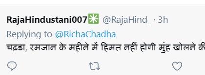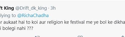 तर अन्य एकाने ‘रमजानच्यावेळीही तू असेच ट्विट करायला हवे होते,’ असे लिहित रिचाला सुनावले. अर्थात अनेकांनी रिचाच्या या ट्विटला पाठींबाही दिला.