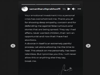 "माझ्या वैयक्तिक आयुष्यात ओढावलेल्या संकटकाळात तुम्ही जो मला भावनिक आधार दिला. तो पाहून मी खरंच खूप भारावून गेले आहे. तुम्ही दाखवलेल्या सहानुभूती, काळजी आणि अफवांपासून माझं संरक्षण केल्याबद्दल मनापासून तुमचे आभार. ते सांगतात, माझं अफेअर होतं. मला मूल नको होतं. मी संधीसाधू आणि आणि आता तर मी गर्भपात केला अशी अफवा पसरली आहे. पण, घटस्फोटाची संपूर्ण प्रक्रिया अत्यंत त्रासदायक असते. त्यातून बाहेर पडण्यासाठी मला थोडा वेळ द्या. माझ्या खासगी आयुष्यावर होणारे हे शाब्दिक हल्ले अत्यंत वाईट आहेत. पण, तुम्हाला मी एक वचन देते, ज्या गोष्टी घडतायेत त्यामुळे आणि ते जे काही बोलतील त्या सगळ्यामुळे मी खचून जाणार नाही", अशी पोस्ट समंथाने तिच्या इन्स्टाग्राम पोस्टमध्ये लिहिली आहे.