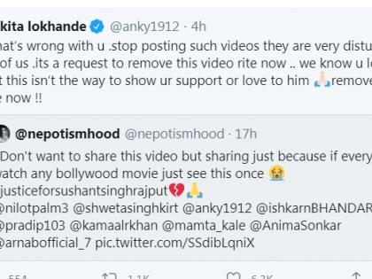 युजरने शेअर केलेला हा व्हिडीओ पाहून अंकिताचा पारा चढला. तिने या युजरने चांगलेच फैलावर घेतले. ‘तुला झाले तरी काय? असे व्हिडीओ शेअर करणे बंद कर. हे सगळे पाहणे आमच्यासाठी प्रचंड वेदनादायी आहे. त्वरित हा व्हिडीओ डिलीट करावा, अशी मी विनंती करते़ तुम्ही सगळे त्याच्यावर (सुशांत) प्रेम करता, मला ठाऊक आहे. पण त्याच्यावरचे प्रेम दर्शवण्याची ही पद्धत नाही. मी हात जोडून विनंती करते, की हा व्हिडीओ डिलीट करा,’ असे अंकिताने लिहिले.