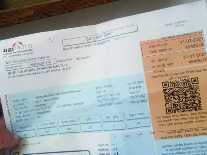 लोकमत न्यूज नेटवर्क खामगाव : शहरातील चांदमारी भागात एका झोपडीत राहणाऱ्या ग्राहकाला महावितरणने चक्क ४९ हजार ४८० रुपयाचे देयक दिले. ग्राहकाने तक्रार करताच वीजबिल कमी करण्यात आले.वीज वितरण कंपनीचा भोंगळ कारभार दिवसेंदिवस चर्चेचा विषय ठरत आहे. शहरातील चांदमारी भागात चक्क झोपडी राहणाऱ्या एका ग्राहकाला भरमसाठ बिल देण्यात आल्याने वीज कंपनीचे पितळ उघडे पडले आहे. चांदमारी भागातील गजानन उखर्डा मसतूद हे बकऱ्या चारतात. त्यांच्या घरात एक ट्यूबलाइट, एक टीव्ही आणि पंखा आहे. याव्यतिरिक्त कोणतीच विजेची उपकरणे ते वापरत नाहीत. तसेच त्यांचे झोपडीवजा घर आहे. असे असताना त्यांना महावितरणने ४९ हजार ४८० रुपयाचे देयक दिले. एवढे बिल पाहून ते भांबावून गेले. त्यांनी वीज वितरण कंपनीच्या अधिकाऱ्यांना संपर्क केला असता सुरूवातीला त्यांच्या वीज बिलाला पर्यायच नसल्याचे सांगण्यात आले. तर काही अधिकाऱ्यांनी दहा हजार रुपये भरा असा उरफाटा सल्ला दिला. त्यांना दर महिन्याला सहाशे ते सातशे रुपये बील येत होते. मजुरी करून ते विजबील भरत होते. परंतु लॉकडाऊनच्या काळात ते वीजबिल भरू शकले नाही. त्यानंतर त्यांना मार्च महिन्यात अव्वाच्या सव्वा बिल देण्यात आले.