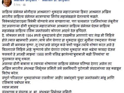 दै. 'लोकमत'मध्ये 1984 मध्ये शुकदासाचे ढोंग उघडकीस आणणारे चार लेख मी लिहिले होते. त्यात ब्रह्मचारी असण्याचे सोंग घेणारा हा शुकदास सुंदर मुलींना एकट्यात 'गेल्या जन्मी मी भगवान कृष्ण ,तू राधा'असे सांगून कसे फशी पाडून त्यांचे शोषण करत असे हे विस्ताराने लिहिले आहे.'कृष्णाचे सोंग घेणारा राधेचा शुकदास' कसा श्रद्धेचा फायदा घेऊन फसवतो हे आजही माझ्या 1988 साली प्रसिद्ध झालेल्या'बुवाबाजी बळी स्त्रियांचा' या पुस्तकात वाचू शकता. असल्या ढोंगी बाबाला व त्याच्या शोषणाला साहित्य संमेलन प्रतिष्ठा देणार असेल तर अखिल भारतीय अंधश्रद्धा निर्मूलन समिती सर्व समविचारी पुरोगामी संघटनांच्या सह कडाडून विरोध करेल. संपूर्ण परिसरात' शुकदासांच्या रासलीला' जाहीर सभांद्वारे पुन्हा जनतेसमोर मांडू आणि रसिकांचे प्रबोधन करू.