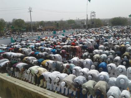 खामगाव : रमजान महिन्याच्या समाप्तीनंतर ५ जुनरोजी शहरातील मुस्लिम समाज बांधवानी सकाळी ९.१५ वाजता ईद-उल-फितरची नमाज अदा केली. स्थानिक सजनपुरी स्थित ईद गाहवर सकाळपासूनच मुस्लीम समाज बांधवांनी गर्दी केली होती.