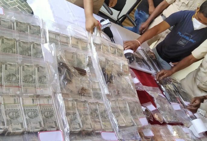 जप्त करण्यात आलेला मुद्देमाल!- पिवळ्या धातूच्या नकली गिन्नी १७ किलो ६५० ग्रॅम(किं १८ हजार )- पांढºया धातुचे दागदागीणे ०२ किलो ५०० ग्रॅम(१ लाख)- सोन्याचे दागिणे ५६ ग्रॅम(३ लाख)- देशी पिस्तुल(०६ एमएम) दोन नग(५९ हजार)- लोखंडी तलवार दोन नग (२ हजार)- लहान मोठे लोखंडी सुरे १० नग (३ हजार)- टोकदार लोखंडी भाले ०५ नग(२ हजार)- लाकडी फरशी कुºहाड एक नग (४०० रुपये)- सबमर्शीबल पंप एक नग(२१ हजार)- मोबाईल २६ नग(७० हजार)