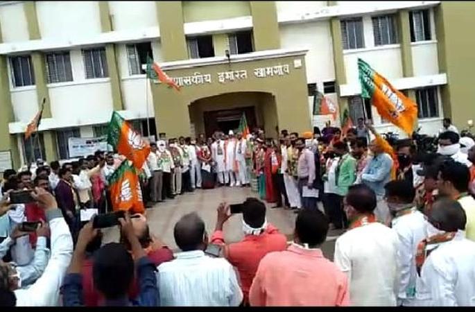 खामगाव ::- शेतकरी विरोधी असलेल्या महाविकास आघाडी सरकारच्या विरोधात आज भाजपच्या वतीने तहसील कार्यालयासमोर तीव्र शब्दात निदर्शने करीत शेतकरी विरोधी अध्यादेशाची होळी करून निषेध करण्यात आला. *पंतप्रधान मा. श्री नरेंद्रजी मोदी यांच्या सरकार ने संसदेच्या दोन्ही सभागृहात ऐतिहासिक कृषी विषयक विधेयक मंजूर करून शेतकऱ्यांच्या जीवनात आमूलाग्र क्रांती घडविणारे पाऊल उचललेले आहे . मात्र कांग्रेस आणि विरोधक विनाकारण कांगावा करीत आहे . महाविकास आघाडी सरकारच्या माध्यमातून मोदी आणि फडणविस सरकार ने दिलेले शेतकऱ्यांचे स्वतंत्र हिरावणारा स्थगिती आदेश काढला, आता शेतकरी कृषी उत्पन्न बाजार समिती मध्ये मतदान करू शकणार नाहीत. त्यामुळे या सरकारचा निषेध म्हणून भाजप जिल्हाध्यक्ष तथा आमदार आकाश दादा फुंडकर यांच्या मार्गदर्शनात या स्थगिती आदेशाची आज तहसील कार्यालय समोर भारतीय जनता पार्टी खामगाव विधानसभाच्यावतीने होळी करून राज्यातील शेतकरी विरोधी महविकास आघाडी सरकार विरोधात तीव्र "निषेध आंदोलन केले. या आंदोलनात भाजपचे किसान आघाडी जिल्हाध्यक्ष गजाननराव देशमुख, तालुका अध्यक्ष सुरेश गव्हाळ, शहराध्यक्ष चंद्रशेखर पुरोहित, शरदचंद्र गायकी, रामदादा मोहिते, नगराध्यक्ष सौ अनिताताई डवरे, न प सभापती, नगरसेवक, जि प सदस्य, प स सदस्य, तालुका , शहराचे पदाधिकारी, युवा मोर्चा, महिला आघाडी, विध्यार्धी आघाडी, किसान आघाडी व इतर आघाडीचे प्रमुख पदाधिकारी व कार्यकर्ते मोठ्या संख्येने उपस्थित होते.