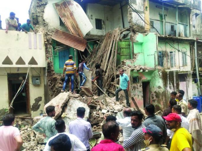 लोकमत न्यूज नेटवर्कखामगाव: स्थानिक जुना सराफा परिसरात एक शिकस्त इमारत कोसळली. यात इमारतीत दबलेल्या एका वृद्ध महिलेला वेळीच बाहेर काढण्यात यश आले. त्यामुळे सुदैवाने कोणतीही जीवित हानी झाली नाही. दुपारच्या वेळी ही घटना घडल्याने पुढील अनर्थ टळला. तथापि, शिकस्त इमारतीचा मलबा शेजारच्या एका इसमाच्या दुचाकीवर पडल्याने दुचाकीचे मोठे नुकसान झाले. शहरातील जुना सराफा भागात काही शिकस्त इमारती आहेत. यापैकी एक इमारत खासगी औषधालयात काम करणाऱ्या जितेंद्र चव्हाण यांच्या मालकीची असून, या इमारतीत चव्हाण यांच्यासह त्यांची आई, आजी, पत्नी आणि दोन मुली असे एकूण सहा जण वास्तव्यास आहेत. शुक्रवारी दुपारी ११.३५ वाजता दरम्यान इमारत कोसळली. तत्पूर्वी काही विटा आणि मलबा पडून भिंती ढासळत असल्याचे लक्षात येताच, जितेंद्र चव्हाण यांच्या पत्नी शुभांगी चव्हाण, भक्ती (६) आणि आरोही (३) या चिमुकल्या मुलीसहित बाहेर पडल्या. तर वयोवृद्ध आजी सरस्वतीबाई जीवनलाल चव्हाण यांना सकाळीच नातेवाइकांकडे सोडून जितेंद्र चव्हाण कामावर गेले. दरम्यान, ११. ३० वाजताच्या सुमारास चव्हाण यांच्या आई घरात काही सामान आणण्यासाठी गेल्या असतानाच इमारत कोसळली. त्यामुळे त्या घरात अडकून पडल्या. त्यांना शेजारांच्या मदतीने नंतर सुखरूप बाहेर काढण्यात आले. या घटनेमुळे शिकस्त इमारतींचा प्रश्न ऐरणीवर आला आहे.