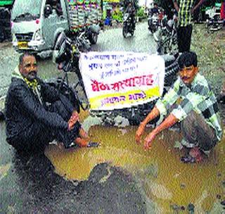 देऊळगाव राजा (जि. बुलडाणा): बेराळा ते जालना १७६ राज्य महामार्ग रस्त्याची अक्षरश: वाट लागली आहे. देऊळगाव राजा शहरातून जाणार्या मार्गावर शेकडो खड्डे पडलेले आहेत. त्यामुळे शहरातील संघर्ष ग्रुपच्यावतीने सोमवारी रस्त्यातील खड्ड्यात बसून आंदोलन करण्यात आले. सततच्या वर्दळीने या खड्डय़ांचे आकारमान वाढत आहे. यामध्ये बहुतांश खड्डे एक ते दोन फूट खोल आहेत. यात पाणी साचून राहिल्याने खड्डय़ाच्या नेमका अंदाज येत नसल्यामुळे अनेकदा वाहनाचा अपघात घडत आहे. या मार्गाने प्रवास करणे म्हणजे जिवंतपणीच मरणयातना केल्याचा प्रत्यय येतो. याकरिता शहरातील संघर्ष ग्रुपचे प्रभाकर मान्टे खड्ड्यामध्ये बसून आंदोलन केले. जालना ते बेराळा फाटा हे अंतर ७८ कि.मी.चे चौपदरी करणाचे कामाचे निविदा के.टी. कन्स्ट्रक्शन इंदूर यांची शासन स्तरावर मंजूर झाल्याने नोंव्हेबर २00९ मध्ये त्यांना काम सुरु करण्याचा आदेश देऊन २४ महिन्यांचे मुदत देण्यात आली होती. नोंव्हेबर २0११ पर्यंंत काम पूर्ण होणे अपेक्षित होते. मग के.टी. कन्स्ट्रक्शन यांचे खासगी अडचणीमुळे ही एजन्सी चौपदरी तर सोडाच एका बाजूने दोन पदरी रस्ता सुद्धा पूर्ण करु शकली नाही. हे काम वेळेच्या आत पूर्ण करुन घेण्याची जबाबदारी सा.बां. विभागाची असतानासुद्धा त्यांनी या गोष्टीकडे कानडोळा केला. यामध्ये अनेक तांत्रिक अडचणी निर्माण झाल्याने, हे काम थंड बस्त्यात पडलेले आहे. आजरोजी देऊळगावराजा शहरातून जाणार्या रस्त्याची दुदर्शा अत्यंत खराब झाल्याने अपघात होण्याची भीती निर्माण होते आहे. अनेक नागरिकांना जिवास मुकावे लागत आहे. या मार्गावर शाळा, महाविद्यालय, दवाखाने, पेट्रोल पंप असल्याने आपघात होण्याची शक्यता नकारता येत नाही, म्हणून स्थानिक संघर्ष ग्रुपचे प्रभाकर मान्टे यांनी खड्ड्यामध्ये बसून आंदोलन केले. दोन तासांत बांधकाम विभागाला जाग आली. शहरातील खड्डे बुजविण्याच्या कामाला सुरुवात झाली.