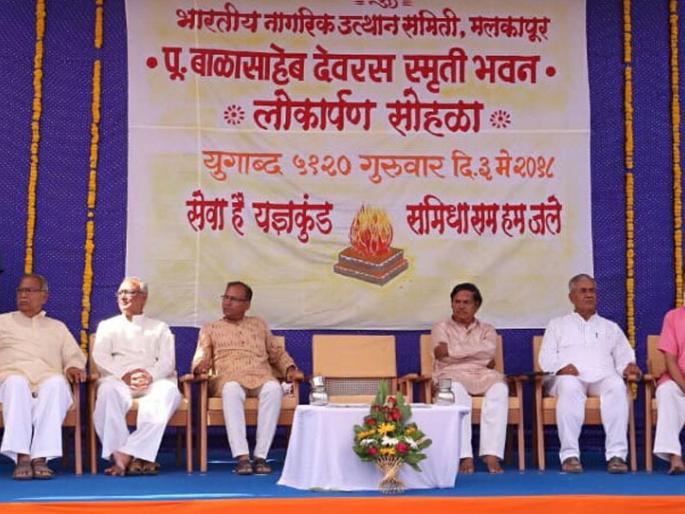 मलकापूर : सर्व विश्वाला सर्वसुखी करणारा हिंदू समाज असून, या समाजाला सबळ कसे करायचं, या समाजातील माणसामागे शक्ती कशी उभी करायची हे कार्य संघ करीत असून, संघाच कार्य अनेकांची तपश्चर्या व तपस्येतून उभ राहिलं आहे, असे प्रतिपादन राष्ट्रीय स्वयंसेवक संघाचे सरसंघचालक मोहन भागवत यांनी उद्बोधनातून केले.भारतीय नागरिक उत्थान समिती मलकापूर द्वारा निर्मित पू. बाळासाहेब देवरस स्मृती भवनाचे लोकार्पण ३ मे रोजी सरसंघचालक मोहन भागवत यांच्या हस्ते संपन्न झाले. या वास्तूत उद्यावत अभ्यासिका व संगणक उपलब्धी आहे. या नूतन वास्तूच्या लोकार्पण निमित्त त्यांच्या जाहीर उद्बोधनचा कार्यक्रम लि.भो. चांडक विद्यालयाच्या प.पू. डॉ.हेडगेवार सभागृहा समोरील मैदानावर आयोजित करण्यात आला होता.याप्रसंगी व्यासपीठावर सरसंघचालक मोहन भागवत यांचेसह संघाचे विभाग संघचालक चित्तरंजन राठी, जिल्हा संघचालक महादेवराव भोजने, भारतीय नागरिक उत्थान समितीचे जिल्हाध्यक्ष बाळासाहेब काळे, सचिव अनिल अग्निहोत्री, तालुका संघचालक विनायकराव पाटील, नगर संघचालक दामोदर लखानी आदी मान्यवर प्रामुख्याने उपस्थित होते. प्रारंभी मोहन भागवत यांच्याहस्ते दिपप्रज्वलन करण्यात येवून भारत माता पूजन करण्यात आले. तद्वतच व्यासपीठावरील मान्यवरांनी मोहन भगवत यांचे पुष्पगुच्छ देवून स्वागत केले.उद्बोधन प्रसंगी पुढे बोलताना मोहन भागवत म्हणाले की, राष्ट्रीय स्वयंसेवक संघ म्हणजे शिस्त अन अनुशासन यांचा मेळ... स्वयंसेवक म्हणजे शुध्द व सात्वीक आत्मीयता... सर संघ कार्यालय म्हणजे आत्मीयता व सूचीतेचा अनुभव देणारं कार्यालय अस अनुभव प्रत्येकाला येतो. तर संघ कार्यालय हे केवळ स्वयंसेवकांचे न राहता ते संपूर्ण समाजाचे व्हावे, समाजाच्या निरपेक्ष सेवेचे केंद्र व्हावे, देशभक्तीच्या विचारांचे प्रेरणास्त्रोत व्हावे असे भाव त्यांनी प्रकट केले.