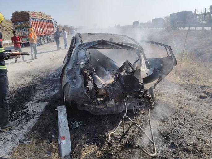 समृद्धी महामार्गावर कार क्रमांक एमएच ०४ एलबी ३१०९ मुंबईवरून अकोल्याच्या दिशेने जात हाेती़ दरम्यान चॅनेल क्रमांक ३१८.८ वर चालकाचे कारवरील नियंत्रण सुटले. यामुळे कार मीडियनमधील क्रॅश बॅरिअरला धडकली आणि बॅरिअरची लोखंडी पट्टी कारच्या समोरून घुसून मागील बाजूने बाहेर पडली. यानंतर कारने पेट घेतला. या अपघातात गणेश सुभाष टेकाळे (वय ४०) आणि राजू महंतलाल जयस्वाल (वय ३२), दोघेही रा़ मुंबई यांचा जागीच मृत्यू झाला.
