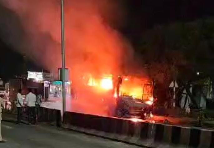 चिखली : चंद्रपूर येथून बुलढाणाकडे वऱ्हाडी घेवून निघालेल्या एका खासगी बसने अचानकपणे पेट घेतल्याने संपूर्ण बस जाळून खाक झाल्याची घटना स्थानिक मेहकर फाटा येथे पहाटे 4 विजेच्या सुमारास घडली आहे. चहा घेण्यासाठी बस थांबलेली असतात हा थरार घडला. या बसमधून 48 वऱ्हाडी प्रवास करीत होते. दैव बलवत्तर म्हणून सर्व वऱ्हाडी या घटनेतून सुखरूपणे बचावले आहेत. मात्र वऱ्हाडी मंडळींच्या बॅग, मौल्यवान वस्तू यामध्ये जळून खाक झाल्या आहेत.