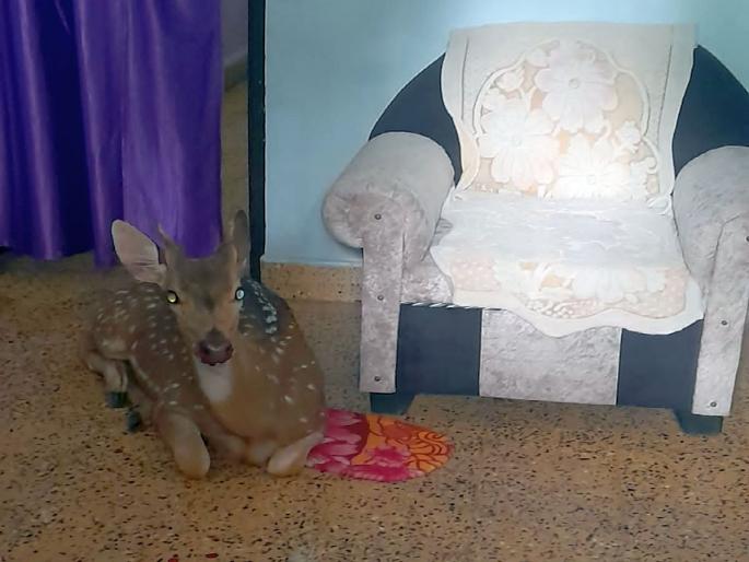 भद्रावती (चंद्रपूर) : आयुध निर्माणी वनक्षेत्रात भरकटलेले एक चितळ बुधवारी शहरातील झिंगुजी वाॅर्ड येथील एका घरात शिरल्याने एकच खळबळ उडाली. एक शिरलेच नाही तर सोफ्याजवळ कुटुंबातीलच एक सदस्य असावे, या अविर्भावात ऐटीत बसून राहिले. या घटनेची माहिती वनविभाग तसेच वन्यप्रेमींना मिळताच त्यांनी घटनास्थळी गाठून त्याला व्यवस्थित पकडून वनक्षेत्रात मुक्त केले.