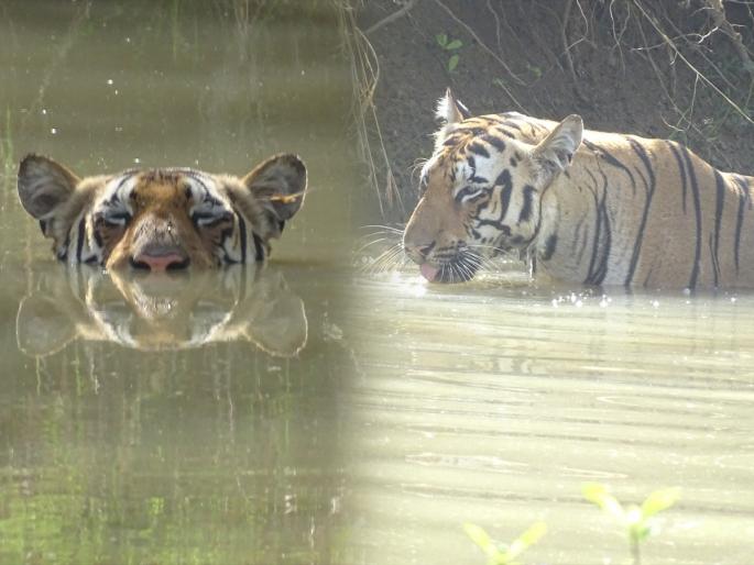 उन्हापासून थोडा थंडावा मिळावा म्हणून कोलारा बफर झोन येथील पाणवट्यात एका पट्टेदार वाघाने प्रवेश केला. त्या पट्टेदार वाघाचे प्रतिबिंब पाण्यात दिसू लागले.