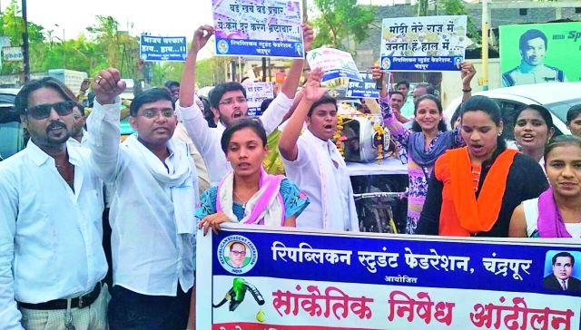 केंद्र शासनाने इंधनाची खरेदी मूल्याच्या दुप्पटीने पेट्रोल व डिझेलची भाववाढ केली आहे. यामुळे जनसामान्यांचे कंबरडेच मोडले आहे. यामुळे महागाईवरही याचा मोठा परिणाम होत आहे. प्रवासी वाहतूक, जीवनावश्यक वस्तू यामध्ये आता मोठ्या प्रमाणात वाढ व्हायला लागली आहे. याचा नाहक भार सामान्य जनतेवर पडताना दिसत आहे. यामुळे जनतेत रोष आहे. ही दरवाढ त्वरित कमी करणे गरजेचे आहे. अन्यथा सामान्य नागरिकांचे बेहाल होणार आहेत. याविरोधात रिपब्लिकन स्टुडंट फेडरेशनच्या वतीने प्रतीक डोर्लिकर, राजस खोबरागडे, संदीप देव, सुलभ खोबरागडे यांच्या नेतृत्वात आंदोलन करण्यात आले. वाहनांची शवयात्रा काढून या दरवाढीचा विरोध करण्यात आला. आंदोलनाची सांगता कस्तुरबा मार्गावरील कोतपल्लीवार पेट्रोलपंपसमोर करण्यात आली.