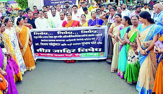 गांधी चौकात भाजपने निदर्शने करून काँग्रेसचे माजी आमदार सुभाष धोटे, आमदार विजय वडेट्टीवार, बाळू धानोरकर यांचा निषेध केला. यावेळी भाजपा पदाधिकारी व कार्यकर्त्यांनी निषेधाचे फलक फडकावत काँग्रेस नेत्यांविरूद्ध जोरदार नारेबाजी केली. यावेळी जि.प. अध्यक्ष देवराव भोंगळे, आमदार नाना श्यामकुळे, भाजप जिल्हाध्यक्ष हरिश शर्मा, आमदार संजय धोटे, महापौर अंजली घोटेकर, उपमहापौर अनिल फुलझेले, मनपा स्थायी समिती सभापती राहुल पावडे, संदीप आवारी, पोंभुर्णा पं.स.सभापती अल्का आत्राम, भाजपा आदिवासी आघाडीचे नेते वाघुजी गेडाम, शिला चव्हाण, अनुराधा हजारे आदींसह अन्य पदाधिकारी व कार्यकर्ते उपस्थित होते.