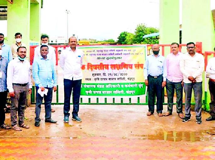 शंकरपूर : संपामुळे चिमूर बाजार समितीत आज खरेदी बंद होती. त्यामुळे दिवसभर शुकशुकाट होता. आंदोलनात समितीचे सभापती माधव बिरजे, राज्य बाजार समिती संघाचे जिल्हा प्रतिनिधी घनश्याम डुकरे, समितीचे सदस्य मोहिनकर, सचिव ढोणे, लेखापाल काशिवार व समितीचे कर्मचारी संपात सहभागी झाले होते. केंद्राने सरकारने ५ जून २०२० रोजी काढलेला अध्यादेश मागे घेण्याची मागणी निवेदनातून केली आहे.