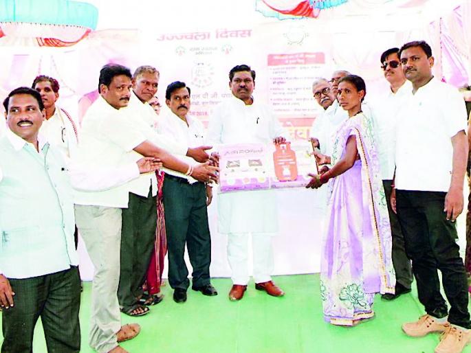 सिंदेवाही : महाजन इंडेनच्या वतीन टेकरी येथील इंदिरा गांधी विद्यालयाच्या प्रांगणात उज्ज्वला दिन साजरा करण्यात आला. कार्यक्रमाचे उद्घाटन खासदार अशोक नेते यांच्या हस्ते पार पडले. तर प्रमुख अतिथी म्हणून पं.स. सभापती मधुकर मडावी, नगराध्यक्ष मोहीनी गेडाम, सरपंच यशवंत सूर्यवंशी, कृषी उत्पन्न बाजार समितीचे सभापती राजेंद्र बोरकर, गोपीचंद गणवीर, उपसरपंच हेमलता खोबरागडे, संजय गजपुरे, होमदेव मेश्राम, गॅस एजन्सी संचालक रमेश महाजन आदी उपस्थित होते. याप्रसंगी खासदार अशोक नेते यांनी प्रधानमंत्री उज्ज्वला गॅस योजना महिलांसाठी नवसंजीवनी ठरली आहे, असे प्रतिपादन केले. याप्रसंगी खा. अशोक नेते यांच्या हस्ते लाभार्थ्यांना गॅस कनेक्शनचे वितरण करण्यात आले. यावेळी निराशा धनघरे, मेघा कामडी, संगिता बावणे, रेशमा कोटरंगे, चंदा शेरकुरे या लाभार्थ्यांनी मनोगत व्यक्त केले. प्रास्ताविक श्रीधर वाढई, संचालन श्रीधर वाढई तर आभार प्रफुल महाजन यांनी केले.