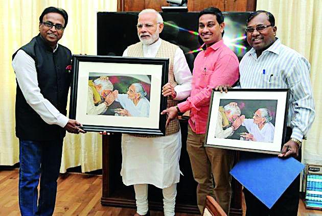 चंद्रपूर : कलावंताची इच्छाशक्ती प्रबळ असते. जिथे कुणी पोहचत नाही, तेथे त्याची कल्पनाशक्ती पोहचते. चंद्रपूरच्या हौशी कलावंताने पंतप्रधान नरेंद्र मोदी यांचे त्यांच्या मातोश्रीसोबतचे तैलचित्र रेखाटले. हे तैलचित्र त्यांना थेट पंतप्रधानांच्याच हातात द्यायचे होते. मात्र वाटेत विघ्नच विघ्न. पंतप्रधानांची भेट घेणे हे सोपे नाही, हे कळल्यावर या कलावंताने आपली इच्छा राज्याचे अर्थमंत्री व जिल्ह्याचे पालकमंत्री सुधीर मुनगंटीवार यांच्यासमोर व्यक्त केली. पालकमंत्र्यांनी लगेच पंतप्रधानांसोबत भेट घडवून आणत त्यांची इच्छा पूर्ण केली.
