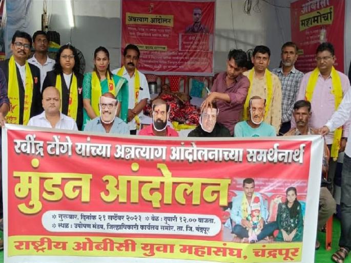 ओबीसींच्या प्रश्नाकडे राज्य सरकार दुर्लक्ष करीत असल्याचा आरोप करून गुरुवारी ओबीसी कार्यकर्त्यांनी रवींद्र टोंगे यांच्या उपोषणस्थळी मुंडन केले. आंदोलन करताना मुख्यमंत्री, उपमुख्यमंत्री व इतर मागासवर्गीय बहुजन कल्याण मंत्र्यांचे मुखवटे लावल्याने नागरिकांत चर्चेचा विषय झाला. मुंडन करून सरकारविरुद्ध घोषणाबाजी झाली. महेश खंगार, अंबादास वनकर, संदीप तोडसाम, दिलीप डोंगरे, कृष्णा चांदेकर, संतोष कुकडकर यांनी मुंडन करत सरकारचा निषेध केला. यावेळी काँग्रेसचे माजी जिल्हाध्यक्ष विनायक बांगडे, माजी नगरसेवक नंदू नागरकर, सुभाष गौर, राजेश बेले, देवा पाचभाई, माजी नगरसेविका सुनीता लोढिया, ॲड. वैशाली टोंगे, विजय फाले उपस्थित होते.
