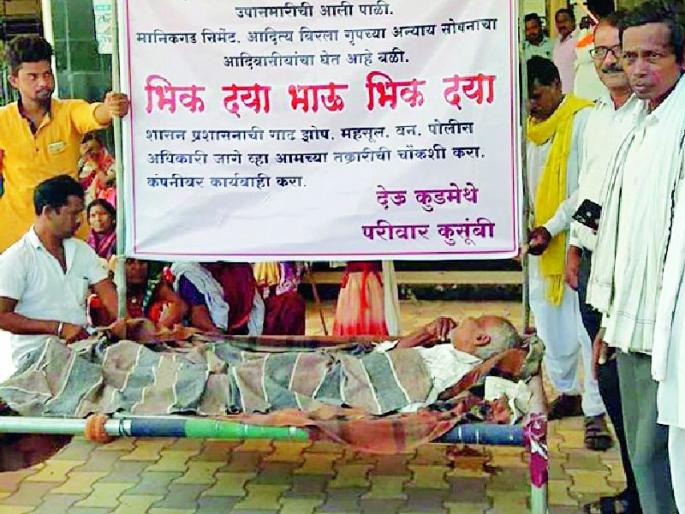 लोकमत न्यूज नेटवर्कराजुरा : माणिकगड पहाडाच्या पायथ्याशी वसलेल्या कुसुंबी गावातील १४ आदिवासी शेतकऱ्यांची शेतजमीन माणिकगड सिमेंट प्रकल्पाने हडप केल्याचा आरोप असून, मागील ७ ते ८ वर्षांपासून आदिवासी बांधव न्याय हक्कासाठी लढा देत आहे. मात्र अजूनपर्यंत प्रशासनाने दखल न घेतल्याने अखेर कुसुंबीच्या आदिवासींनी तहसील कार्यालयाच्या मुख्य प्रवेशद्वाराजवळ आंदोलन सुरू केले आहे. या आंदोलनात महादेव देऊ कुळमेथे हा ६५ वर्षीय आदिवासी खाटेवर झोपून ‘भीक द्या भाऊ’ म्हणत प्रशासनाचे लक्ष वेधून घेत आहे.कुसुंबी येथील १४ आदिवासी शेतकऱ्यांची शेतजमीन माणिकगड सिमेंट प्रकल्पाने २०१२-१३ मध्ये बळकावल्याचा आरोप केला आहे. कंपनीने या मोबदल्यात आदिवासींना आर्थिक मदत केली नाही. सोबतच कुटुंबातील सदस्यांना नोकरीसुद्धा दिली नाही, असे शेतकऱ्यांचे म्हणणे आहे. याबाबत प्रशासनाकडे वेळोवेळी पत्रव्यवहार केला. परंतु, अधिकाऱ्यांनी याकडे दुर्लक्ष केले. त्यामुळे आदिवासींवर उपासमारीची वेळ आली आहे. कंपनी व्यवस्थापनाने नियमबाह्य पद्धतीने रस्ता अडविल्याने शेतकऱ्यांना ये-जा करताना अनेक समस्येला सामोरे जावे लागत आहे. विशेष म्हणजे, कंपनीने बळजबरीने शेतीवर कब्जा करून फसवणूक केली असतानाही गुन्हे मात्र, आदिवासींवर दाखल करण्यात येत असल्याने त्यांच्यात कमालीचा असंतोष पसरला आहे. या आंदोलनात ६५ वर्षीय महादेव कुळमेथे हा आदिवासी आजारी असतानाही सहभागी झाला आहे. त्यांची ४१८ आराजी ८ एकर शेती कंपनीने हडप केल्याचा आरोप आहे. शेती नसल्याने व रोजगाराअभावी त्यांच्यावर उपचारासाठी पैसे नसल्याने त्यांची तब्बेत आणखीच खालावली आहे. हा आदिवासी खाटेवर झोपून भिक द्या भाऊ, म्हणत न्याय मागत आहे. या आंदोलनात ४० ते ५० पीडित आदिवासी शेतकरी व महिलासुद्धा सहभागी झाल्या आहेत. आंदोलनकर्ते भाऊराव कन्नाके, जंगू पेंदोर, काळाशी सिडाम, मारोती तलांडे, झाडू सिडाम, नैताम कुळमेथे, गणेश सिडाम आदींनी माणिकगड सिमेंट व्यवस्थापनावर अॅट्रॉसिटी अंतर्गत गुन्हा दाखल करण्यासोबतच एकरी २५ लाख रुपये मोबदला व एकाला नोकरी देण्याची मागणी केली आहे. जनसत्याग्रहचे आबिद अली यांनी मागण्या न्याय असून, प्रशासन आदिवासींवर अन्याय करीत असल्याचा आरोप केला आहे.