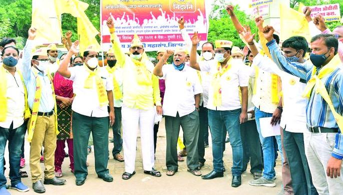 चिमुरात ओबीसी महासंघाचे धरणेचिमूर : आपल्या मागण्या पूर्ण करण्यासाठी ओबीसी महासंघाने चिमूर तहसील कार्यालयासमोर धरणे आंदोलन केले. राष्ट्रीय ओबीसी महासंघाचे राष्ट्रीय समन्वयक प्राचार्य डॉ. अशोक जीवतोडे यांच्या मार्गदर्शनाखाली चिमूर तहसील कार्यालयासमोर हे आंदोलन करण्यात आले. त्यानंतर मुख्यमंत्री उध्दव ठाकरे यांना तहसीलदारांमार्फत निवेदन देण्यात आले. धरणे आंदोलनाचे अध्यक्ष गजानन अगडे होते. यावेळी रामदास कामडी, एम. जी. मानकर, डॉ. सतीश वारजुकर, प्रकाश झाडे, ईश्वर डुकरे, अरुण लोहकरे, राजू लोणारे, नरेंद्र बंडे, संजय डोंगरे ,विलास डांगे, प्रा राम राऊत, प्रा. संजय पिठाडे, अविनाश अगडे, विजय डाबरे, कवडू लोहकरे, भावना बावनकर, वर्षा शेंडे , पुष्पा हरणे, उषा हिवरकर, कोमल वंजारी, ममता वंजारी आदी उपस्थित होते.