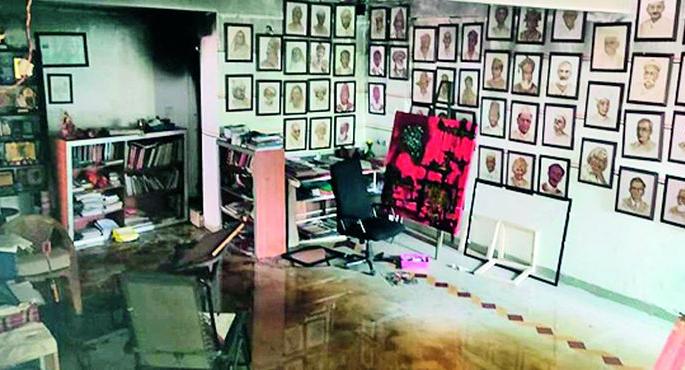 लोकमत न्यूज नेटवर्कवरोरा : स्वतः दिव्यांग असताना कर्मयोगी यांच्या प्रेरणेने प्रेरित झालेल्या एका शिक्षकाने स्वतःच्या रक्ताने थोर महात्म्यांचे पेंटिंग्ज तयार केले. घरात काटकसरीने आर्ट गॅलरी लावली. या गॅलरीला आग लागली. त्यात रक्ताने तयार केलेले पेंटिंग्ज भस्मसात झाले त्यामुळे महारांगोळीकार हतबल झाला आहे.स्वतः दिव्यांग असताना त्याने कलेचा छंद असून तो जोपासला. कर्मयोगी बाबा आमटे यांच्या महारोगी सेवा समितीने आनंदवनातील मूकबधिर शाळेत कलाशिक्षक म्हणून प्रल्हाद ठक यांची नियुक्ती केली. कर्मयोगी बाबांच्या प्रेरणेने प्रल्हाद ठक प्रभावित झाले. त्यांनी चंद्रपूर पोलीस ग्राउंडवर महारांगोळी काढण्याचा विक्रम केला. यासोबतच स्वतःच्या रक्ताने थोर समाज सेवकांचे पेंटिंग्ज तयार केले. त्यांच्या आनंदवन चौक गजानन नगर स्थित असलेल्या गॅलरीला अचानक आग लागली आणि हे सर्व संपून गेले.शनिवारी पहाटे दीडच्या सुमारास खालच्या मजल्यावरील गॅलरीत धूर निघत असल्याचे त्यांना लक्षात आले. खाली जाऊन बघितले तर अर्धेअधिक चित्रे, रंग आणि रंग कामाचे साहित्य आगीने गिळंकृत केले होते. आग विझविण्याचा आटोकाट प्रयत्न त्यांच्या कुटुंबीयांनी केला. मात्र तोपर्यंत सारे रंग काळवंडले होते. चित्रांची किंमत आणि त्याचे झालेले नुकसान याचे मोल सांगता येणे कठीण आहे. तरी अंदाजे १७ लाखांचे नुकसान झाल्याचा प्राथमिक अंदाज त्यांनी पोलिसात केलेल्या तक्रारीत व्यक्त केला आहे. भिंतीचे रंग उजळतीलही मात्र स्व-रक्ताने रंगविलेले चित्र पुन्हा कसे उभे राहतील, असा यक्षप्रश्न प्रल्हाद ठक यांच्या पुढे उभा ठाकला आहे.