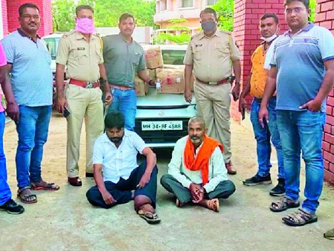 लोकमत न्यूज नेटवर्कबल्लारपूर : येथून जवळच असलेल्या जुनोना येथील वनविभागाच्या तपासणी नाक्यावर कारमध्ये असलेला दारुसाठा पोलिसांनी जप्त केला. या प्रकरणी दोघांना अटक करण्यात आली आहे.यामध्ये १ लाख २० हजार रुपये किंमतीची ८०० नग देशी दारू, मारुती सुझुकी कार ४ लाख रुपये असा एकूण ५ लाख २० हजार रुपयांचा माल जप्त केला. या प्रकरणी दुलंदर सहारे, प्रभुचरण नायडू रा. मिंढाळा ता. नागभीड यांना ताब्यात घेण्यात आले आहे. ही कारवाई पोलीस निरीक्षक एस. एस. भगत यांच्या मार्गदर्शनाखाली सहाय्यक पोलीस निरीक्षक विकास गायकवाड, विनीत घागे, कांबळे, सुधाकर वरघणे, संतोष दंडेवार, शरद कुडे, अजय हेडाऊ, श्रीनिवास बाबीटकर यांच्यासह कर्मचाऱ्यांनी केली.