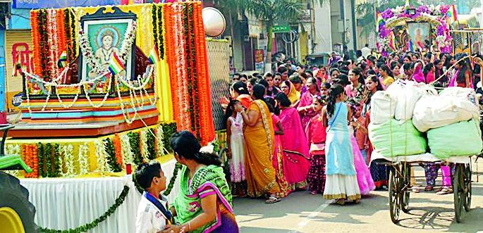 ऑनलाईन लोकमतचंद्रपूर : महावीर जयंतीचे औचित्य साधून सकल जैन समाजाच्या वतीने गुरुवारी रथावर आरुढ भगवान महावीर यांची शोभायात्रा काढण्यात आली. यावेळी चंद्रपुरातील जैन समाजबांधव सहभागी झाले होते.स्थानिक जैन भवनातून सकाळी ७ वाजता ही शोभायात्रा काढण्यात आली. शहराच्या मुख्य मार्गाने ही शोभायात्रा निघाली. ठिकठिकाणी शोभायात्रेचे स्वागत करण्यात येत होते. यासोबतच मार्गावर ठिकठिकाणी शितपेयाचीही व्यवस्था करण्यात आली होती. यावेळी जैन स्थानकवासी श्रावक संघाचे अध्यक्ष योगेश भंडारी, मूर्ती पूजक संघाचे सचिव राजेश डागा, दिगंबर जैन मंदिराचे अध्यक्ष सुभाष जैन, दादावाडीचे अध्यक्ष राज पुगलिया यांनी मार्गदर्शन केले. पाण्याच्या टाकीजवळ महावीर इंटरनॅशनल संस्थेच्या वतीने थंड पाण्याची व्यवस्था करण्यात आली होती. आझाद बागेजवळ आनंद नागरी सहकारी बँकेच्या वतीने सरबतचे वितरण करण्यात आले. जिनदल सुरी मंडळाकडून शितपेय, जैन मित्र मंडळाकडून फळाचे वितरण करण्यात आले. यासोबत जिल्हा सामान्य रुग्णालयातील नवजात बाळांना महावीर इंटरनॅशनलच्या वतीने बेबी कीट वाटप करण्यात आले. शोभायात्रेत जितेंद्र चोरडिया, राहुल पुगलिया, फेनबाबू भंडारी, संदीप बांठिया, दीपक डगली, रोहित पुगलिया, राजेश चोरडिया, जितेंद्र मेहेर, विशाल मुथा, डॉ. महावीर सोईतकर, अजय संघवी, योगेश पुगलिया, नरेश सुराणा, सुधा सिंघवी, सरिता चोरडिया, राजश्री मुथा, नेहा बैर, कविता डागा, भारती बांठिया, सरिता मेहेर, रश्मी भंडारी, कमलाबाई चोरडिया आदी सहभागी झाले होते.