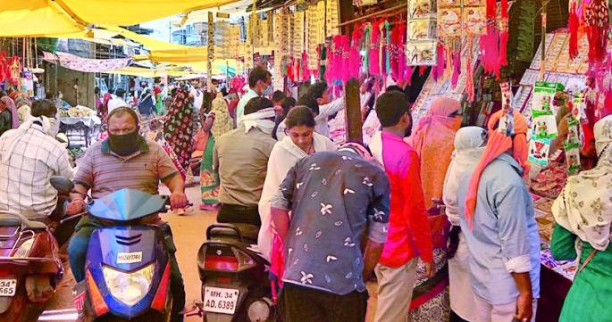 लोकमत न्यूज नेटवर्कचंद्रपूर : जिल्ह्यात दिवसागणिक कोरोनाचा संसर्ग वाढत आहे. त्यामुळे लॉकडाऊनमध्ये शिथिलता आणून जीवनावश्यक दुकानांसह बहुतांश दुकाने सुरू ठेवण्यास प्रशासनाने परवागनी दिली. १ ते ३१ जुलैपर्यंत कलम १४४ लागू करून जमावबंदीचा आदेश जिल्हाधिकाऱ्यांनी जारी केला. मात्र, प्रशासनाने सातत्याने सूचना देवूनही नागरिकांकडून जमावबंदी धाब्यावर ठेवल्याचे चित्र जिल्ह्यात दिसून येत आहे. सहा फुटाचे सोशल डिस्टन्सिंग पाळण्यातही नागरिक कुचराई करीत असल्याने कोरोनाच्या उद्रेकाची शक्यता वर्तविण्यात येत आहे.चंद्रपूर जिल्ह्यात शनिवारपर्यंत ५५१ रूग्ण कोरोना बाधित झाल्याचे उघडकीस आल्याने प्रशासकीय वर्तुळातही आता चिंता व्यक्त होत आहे. आरोग्य विभागाने आतापर्यंत २४ हजार १४३ संशयीत व्यक्तींचे नमूने घेतले. यातील २२ हजार ८५५ व्यक्तींचे वैद्यकीय अहवाल प्राप्त झाले आहेत. जिल्ह्यात कोरोनाचा पहिला रूग्ण आढळल्यापासून बाधितांची संख्या प्रचंड वेगाने वाढत आहे. जुलै महिन्यात दररोज सुमारे १५ ते १८ व्यक्ती कोरोना पॉझिटिव्ह निघाल्याची नोंद आहे. कोरोनाचा कहर असा सुरू राहिल्यास परिस्थिती हाताबाहेर जावू शकते, ही शक्यता लक्षात घेवून प्रशासनाने प्रतिबंधात्मक उपयायोजना सुरू केल्या. वेगवगळ्या माध्यमांतून जागृती सुरू असूनही नागरिक सार्वजनिक ठिकाणी विनाकारण गर्दी करीत आहेत.दुकानांसमोरील सॅनिटायझर हटविलेदुकाने सुरू करण्यास परवानगी दिल्याने आर्थिक व्यवहार हळूहळू रूळावर येत आहेत. कोरोना रूग्णांची संख्या वाढत असतानाही जिल्ह्यात जीवनाश्यक वस्तुंची दुकाने सुरू ठेवण्यास एक तासांचा जादा कालावधी देण्यात आला. ग्राहक दुकानात आल्यास आधी हात धुण्यासाठी सॅनिटायझरची व्यवस्था करण्याच्या सूचना प्रशासनाने दिल्या होत्या. लॉकडाऊन काळात बहुतांश दुकानदारांनी या सूचनांचे पालन केले होते. मात्र, आता बºयाच व्यावसायिकांनी स्वत:च्या दुकानासमोर सॅनिटायझर बॉटल हटविल्याचे दिसून येत आहे.फक्त मास्क न वापरणाऱ्यांविरूद्धच कारवाईसार्वजनिक ठिकाणी मास्कचा वापर न करणाऱ्यांविरूद्ध प्रशासनाकडून २०० रूपयांचा दंड आकारला जात आहे. संबंधित व्यक्तींविरुद्ध भारतीय दंड संहिता कलम १८८, २६९, २७०, २७१ अन्वये कारवाई सुरू आहे. मात्र,चंद्रपूर शहरासह जिल्ह्यातील तालुकास्थळावरील मुख्य बाजारपेठ, वर्दळीच्या सार्वजनिक ठिकाणी पाच किंवा पाचपेक्षा जास्त व्यक्ती एकत्र येत असतानाही प्रशासनाकडून बघ्याची भूमिका घेणे सुरू असल्याचा आरोप काही जागरूक नागरिकांनी केला आहे. रविवारी चंद्रपूर शहरातील बाजार सुरू होता. या बाजारातही प्रचंड गर्दी दिसून आली.