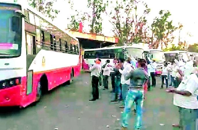 लोकमत न्यूज नेटवर्कचंद्रपूर : ४२ दिवसांच्या लॉकडाऊननंतर आंध्रप्रदेश व तेलंगणा राज्यात अडकलेल्या मजुरांना जिल्ह्यातील विविध भागात घेऊन जाण्यासाठी एसटी महामंडळाची पहिली बस चंद्रपूर आगारातून रविवारी रवाना झाली. पालकमंत्री विजय वडेट्टीवार यांनी जिल्हा अंतर्गत बस सुरू करण्याची सूचना केल्यानंतर महामंडळाच्या बसेसची थांबलेली चाके गतिशील झाली.तेलंगणा राज्यातून हैदराबाद येथून चंद्रपूर जिल्ह्यातील अडकलेल्या मजुरांना घेऊन त्या राज्याची बस रविवारी चंद्रपूर बसस्थानकात आली. त्यामुळे हैद्राबादवरून चंद्रपूरला पोहोचलेल्या मजुरांना पुढे कसे जावे, हा प्रश्न होता. पालकमंत्री कार्यालयाशी त्यांनी संपर्क साधल्यानंतर पालकमंत्री विजय वडेट्टीवार यांनी जिल्हाधिकारी डॉ. कुणाल खेमनार यांना सूचना केली. त्यानंतर सिंदेवाही, नागभीड, मूल, ब्रह्मपुरी तालुक्यांच्या गावाला जाण्यासाठी बसची व्यवस्था करण्यात आली. सोमवारपासून राज्य शासनाने मजुरांना एसटी बसेस सुरु करण्याचा निर्णय घेतला आहे. आज रविवारीच हे मजूर चंद्रपूरमध्ये पोहचल्यामुळे २६ जणांच्या ताफ्याला मूल, सिदेवाही, नागभीड, ब्रम्हपुरी येथे रवाना करण्यात आले.तत्पूर्वी, गेल्या अनेक दिवसांपासून आगारात जमा असलेल्या एसटी बसेसचे सॅनिटायझेशन करण्यात आले. तसेच या ठिकाणी उपस्थित असणाऱ्या प्रवाशांनादेखील आवश्यक वैद्यकीय सल्ला व शारिरिक अंतर राखण्याचे निर्देश दिले गेले. केवळ २६ नागरिकांना या बसमधून रवाना करण्यात आले. यावेळी आगार व्यवस्थापक सचिन डफळे व आरोग्य पथक उपस्थित होते.राजुऱ्यातून दहा बसेस रवानातेलंगणातून स्थलांतरित झालेले आणि राजुरा तालुक्यात असलेल्या सुमारे २५० मजुरांना घेऊन राजुरा आगारातून महामंडळाच्या दहा बसेस सोडण्यात आल्या. यावेळी नगराध्यक्ष अरुण धोटे, नगरसेवक आनंद दासरी, तहसीलदार रवींद्र होळी, राजुरा आगार व्यवस्थापक आशिष मेश्राम, मुख्याधिकारी आर्शिया जुही आदी उपस्थित होते सोडण्यात येणाऱ्या दहा बसेस सॅनिटाइझ करण्यात आल्या. प्रत्येक प्रवाश्याची काळजीपूर्वक आरोग्य तपासणी करण्यात आली. त्यानंतर यादीनुसार सर्व मजूर प्रवाशांना बसमध्ये बसविण्यात आले. एसटीचे चालक, वाहक यांचीही आरोग्य तपासणी करण्यात आली.