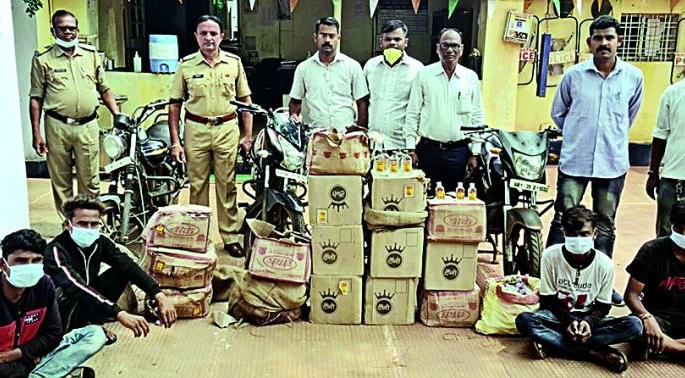 दुचाकी वाहनातून दारुची वाहतूक होत असल्याची माहिती ब्रह्मपुरी पोलिसांना मिळाली. या माहितीच्या आधारावर ठाणेदार बाळासाहेब खाडे यांच्या नेतृत्वात कब्रस्थान रोडवर नाकाबंदी केली. यावेळी एम एच ३४ एजे ४००५, एमएच २९ झेड ९५५३ या दुचाकीला थांबवून ९० एमएलच्या १० पेटा, १८० एमएलच्या आठ पेट्या, चार मोबाईल, दुचाकी असा एकूण तीन लाख ५६ हजार रुपयांचा मुद्देमाल जप्त करण्यात आला. यावेळी चौघांना अटक करण्यात आली. ही कारवाइ पोलीस निरीक्षक बाळासाहेब खाडे यांच्या मार्गदर्शनाखाली डीबी पथकाचे पो. ह. खोब्रागडे, ना. पो. शी मुकेश, पो. शी. अजय, योगेश, अजय नागोसे आदींनी केली.
