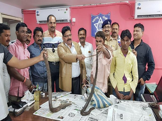 या बाबत अधिक माहिती अशी कि, वाळूज पंढरपूर येथे शुक्रवारी संध्याकाळी दोघेजण मांडूळ विक्रीसाठी येणार असल्याची माहिती गुन्हेशाखेचे पोलीस निरीक्षक शिवाजी कांबळे यांना खबऱ्याकडून मिळाली. यानुसार सहाय्यक पोलीस निरीक्षक घनश्याम सोनवणे यांच्या पथकाने औरंगाबाद- अहमदनगर रोडवरील सुंदर आर्केड येथे सापळा रचला. रात्री ७.३० वाजेच्या दरम्यान दीपक मोरे व सुनील चव्हाण हे दोघे या ठिकाणी आले असता त्यांना पथकाने ताब्यात घेतले. त्यांच्याकडून दोन मांडूळ हस्तगत करण्यात आले. जंगलात खोदकाम करताना दोन्ही मांडूळ सापडले असून त्याची प्रत्येकी ५५ लाखाला विक्री करणार होतो अशी माहिती त्या दोघांनी दिली.