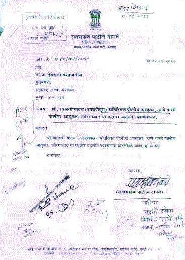 खा. दानवे यांनी गेल्या वर्षी दिलेल्या पत्रावर मुख्यमंत्री सचिवालय आवक-जावकीच्या क्रमांकासह गृहमंत्रालयातील जबाबदार अधिकाऱ्यांच्या स्वाक्षºया होत्या. प्रशासकीय बदल्यांमध्ये राजकीय ढवळाढवळ कोणत्या स्तरावर आणि कशा प्रमाणात सुरू आहे, यावरून खा. दानवेंनी दिलेले ते पत्र गेल्या वर्षी चांगलेच गाजले होते. ठाणेकर यादव जेव्हा औरंगाबादेत आले तेव्हा त्यांनी मुख्यमंत्र्यांना नियमित खुश ठेवण्याचा प्रयत्न केला. जेव्हा जेव्हा मुख्यमंत्री शहरात आले, त्यांच्या स्वागताचे होर्डिंग्ज यादवांनी लावून त्यांना सलामी देण्याचा प्रयत्न केला. खाकीतील ही प्रसिद्धी अनेकांच्या नजरेत आली. त्यामुळे माध्यमातून त्यांच्यावर सडकून टीकाही झाली.