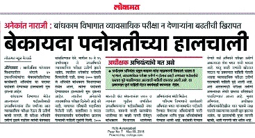 लोकमत न्यूज नेटवर्कऔरंगाबाद : सार्वजनिक बांधकाम विभागातील पदोन्नतीच्या प्रस्तावाला खीळ बसण्याची दाट शक्यता निर्माण झाली आहे. पदोन्नतीसाठी बांधकाम विभाग खात्याकडे पाठविण्यात आलेल्या प्रस्तावात त्रुटी असल्याने सचिव पातळीवरून खुलासा मागविण्यात आला. ३ मे रोजीच्या अंकात ‘लोकमत’ने प्रकाशित केलेल्या वृत्ताची सचिव पातळीवरून दखल घेतली गेली.सार्वजनिक बांधकाम विभागातील अंदाजे ४० उपअभियंत्यांना कार्यकारी अभियंता या पदावर पदोन्नती देण्याच्या हालचाली सुरू झाल्या आहेत. बांधकाम विभागात सेवेत आल्यानंतर पदोन्नतीसाठी उपअभियंत्यांना तीन वर्षांच्या आत व्यावसायिक परीक्षा देऊन ती उत्तीर्ण व्हावे लागते. २००० साली बांधकाम विभागाच्या सेवेत आलेल्या अभियंत्यांना पदोन्नती देण्याच्या हालचाली सुरू आहेत. त्यातील अनेकांनी व्यावसायिक परीक्षा दिलेली आहे की नाही, याबाबत विभागाकडे तक्रारी करण्यात आल्या. त्या तक्रारींकडे दुर्लक्ष करीत पश्चिम विभागाचे कार्यकारी अभियंता भगत यांच्यामार्फत पदोन्नती देण्यात येणाऱ्या अभियंत्यांची यादी अधीक्षक आणि मुख्य अभियंत्यांकडे देण्यात आली आहे.पदोन्नती देण्यात येणारे सर्व अभियंते परीक्षा उत्तीर्ण असल्याचा शेरा भगत यांनी मारला. व्यावसायिक परीक्षा उत्तीर्ण नसताना ती परीक्षा उत्तीर्ण असल्याचा लेखी प्रस्ताव वरिष्ठांकडे पाठविण्यात आला. सचिवांनी स्पष्टीकरण मागविल्यामुळे तत्कालीन मुख्य अभियंता एम.एम. सुरकुटवार, अधीक्षक अभियंता अतुल चव्हाण यांनी या प्रकरणात फारसे लक्ष घातले नसल्याचे स्पष्ट झाले आहे.२००० सालची बॅच संपल्यानंतर २००२ व त्यानंतर पुढील वर्षांतील उपअभियंत्यांचा पदोन्नतीसाठी नंबर लागेल. मागील १० ते १५ वर्षांपासून जे उपअभियंते व्यावसायिक परीक्षा उत्तीर्ण झाले आहेत, त्यातील अनेक जण पदोन्नतीच्या प्रतीक्षेत आहेत.सचिवांनी दिले तपासणीचे आदेशबांधकाम विभाग सचिवांनी अधीक्षक अभियंत्यांशी संपर्क करून या प्रकरणात नेमके काय घडले, ते तपासण्याचे आदेश दिले. त्यानुसार कार्यकारी अभियंता भगत यांनी वरिष्ठ पातळीवर खुलासा पाठविल्याची माहिती आहे. कशाच्या आधारे प्रस्ताव दिले, कुणी-कुणी प्रस्ताव तपासले. शहानिशा न करता शासनाकडे प्रस्ताव कसे गेले. ही बाब वरिष्ठ पातळीवर गांभीर्याने घेतल्यास या प्रकरणात मोठ्या प्रमाणावर कारवाई होण्याचे संकेत आहेत, तसेच मुख्य व अधीक्षक अभियंत्यांनी या प्रकरणात फारसे लक्ष दिलेले नसल्याचे दिसते. राज्य पातळीवरून आलेले सर्व पदोन्नतीचे प्रस्ताव आता तपासूनच पुढे जाण्याची शक्यता आहे.