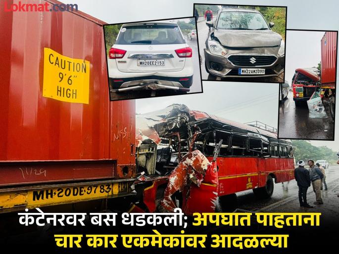 अपघात पाहताना ४ कार एकमेकांवर धडकल्यारस्त्यावरील कंटेनर-बसचा अपघात पाहण्यासाठी एका कारणे गती कमी केली. यामुळे पाठीमागून आलेल्या ४ कार देखील एकमेकांना धडकल्या. सुदैवाने यात कोणाला इजा झाली नाही. त्यानंतर दोन कार घटनास्थळावरून निघून गेल्या. तर दोन कार घटनास्थळी उभ्या होत्या.