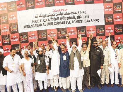 औरंगाबाद : नागरिकत्व सुधारणा कायदा (सीएए) आणि राष्ट्रीय नागरिकत्व नोंदणी (एनआरसी)च्या विरोधात शुक्रवारी औरंगाबाद अॅक्शन कमिटीतर्फे जामा मशीद ते विभागीय आयुक्त कार्यालयापर्यंत ऐतिहासिक मोर्चा काढण्यात आला. या मोर्चाने आजपर्यंतचे सर्व विक्रम मोडले. केंद्र शासनाने एनआरसी, सीएए कायदा परत घेतलाच पाहिजे असा हुंकार उपस्थित अथांग जनसागराने दिला. त्याला खा. मनोज झा, वंचित बहुजन आघाडीचे संस्थापक प्रकाश आंबेडकर, आ. जितेंद्र आव्हाड, नवनिर्वाचित आ. झिशान बाबा सिद्दीकी यांनी आपल्या शब्दांत जोरदार समर्थन दिले. मोर्चात ४० पेक्षा अधिक पक्ष संघटनांनी सहभाग नोंदविला. औरंगाबादसह इतर जिल्ह्यांतूनही मोठ्या संख्येने नागरिक मोर्चात सहभागी झाले होते. औरंगाबाद शहरात मुस्लिमबहुल भागांत दिवसभर कडकडीत बंद पाळण्यात आला.