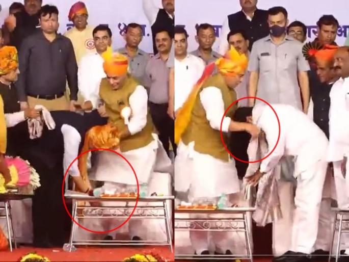 दरम्यान, या कार्यक्रमात महाराष्ट्र शासनाच्यावतीने राजनाथ सिंह यांचा सत्कार करण्यात आला. तर, राजनाथ सिंह यांच्याहस्तेही शिंदे-फडणवीस यांचा सन्मान करण्यात आला. त्यावेळी, देवेंद्र फडणवीस यांनी खाली वाकून, पाय धरुन राजनाथ सिंह यांचे आशीर्वाद घेतले. फडणवीसांनंतर मुख्यमंत्री एकनाथ शिंदे यांनीही खाली वाकून राजनाथ सिंहांना नमस्कार केला.