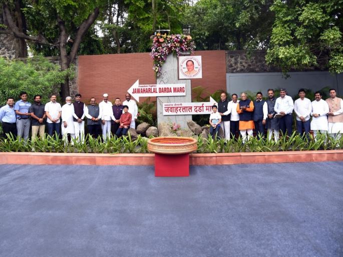 लोकमत भवनच्या पाठीमागील गेटजवळ स्वातंत्र्य सेनानी जवाहरलाल दर्डा मार्गाचे दोन फलक लावण्यात आलेले आहेत. तसेच जवाहरलाल दर्डा यांचा फोटो व त्याखाली १९२३ ते २०२३ अशी अक्षरे लिहिलेली आहेत. पाण्याने भरलेल्या हौदात पाहुण्यांच्या हस्ते पेटत्या मेणबत्त्या ठेवून उद्घाटन सोहळा संपन्न झाला. यावेळी दर्डा परिवारातील लोकमत सखी मंचच्या संस्थापिका आशू दर्डा, लोकमत महामॅरेथॉनच्या संस्थापिका रुचिरा दर्डा, आर्यवीर दर्डा व अधिराज दर्डा यांचीही विशेष उपस्थिती होती. तर शहर भाजपचे अध्यक्ष शिरीष बोराळकर, शिवसेना शिंदे गटाचे जिल्हा प्रमुख राजेंद्र जंजाळ, देवगिरी प्रतिष्ठानचे अध्यक्ष विनोद पाटील, माजी नगरसेवक महेश माळवतकर, जि. प.चे माजी अध्यक्ष श्रीराम महाजन, सिल्लोड नगर परिषदेचे गटनेते नंदू सहारे, वरुड काजीचे सरपंच दिलावर बेग, जि. प. चे माजी सभापती प्रमोद जगताप आदींचीही यावेळी उपस्थिती होती.