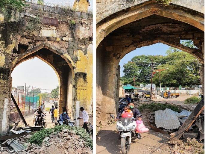 ऐतिहासिक मेहमूद दरवाजाला मागील वर्षी एका चारचाकी वाहनाने धडक दिली हाेती. त्यामुळे दरवाजाला माेठ्या प्रमाणात तडे गेले हाेते. महापालिकेने सावधगिरी म्हणून दरवाजाच्या आतील भागात लोखंडी अँगल लावले होते. तीन महिन्यांपूर्वी आणखी एका वाहनधारकाने दरवाजाला धडक दिली. यात दरवाजाचा आर्च (स्लॅब) वाकला. दरवाजाचा मध्यभाग कोणत्याही क्षणी कोसळेल अशी स्थिती निर्माण झाली. मनपा प्रशासक आस्तिककुमार पाण्डेय यांनी पाहणी करून स्मार्ट सिटी प्रशासनाला डागडुजीसाठी अंदाजपत्रक, निविदाप्रक्रिया राबविण्याची सूचना केली. मेंटॉर यांनी हा निर्णय सीईओ स्तरावर घेण्याची मुभा दिली. दरम्यान, महापालिकेच्या वॉर्ड अ कार्यालयाने तातडीने दरवाजाच्या दोन्ही बाजूंनी सुरू असलेली वाहतूक बंद केली होती. पालिकेने लावलेले सर्व पत्रे नागरिकांनी आता गायब केले आहेत. या धोकादायक दरवाजातून २४ तास दुचाकी वाहनधारक ये-जा करीत आहेत. त्याचप्रमाणे परिसरात राहणारे नागरिकही याच दरवाजातून ये-जा करीत असल्याचे विदारक चित्र पहायला मिळत आहे.