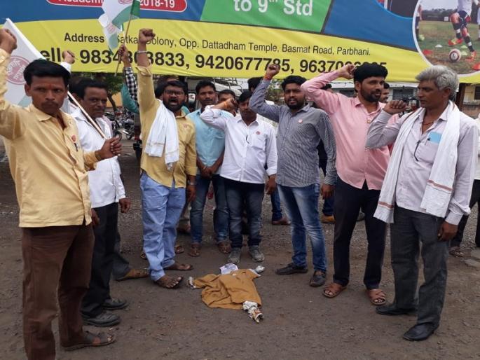 केंद्रीय कृषीमंत्री राधामोहन सिंह यांनी दोन दिवसांपूर्वी शेतकऱ्यांविषयी केलेल्या वक्तव्याचा परभणीत निषेध नोंदविण्यात आला. आज सकाळी ११ वाजेच्या सुमारास स्वाभिमानी शेतकरी संघटनेचे कार्यकर्ते जिल्हाधिकारी कार्यालय परिसरात पोहचले. यावेळी केंद्रीय कृषीमंत्र्यांच्या विरोधात घोषणाबाजी करण्यात आली. त्यानंतर प्रतिकात्मक पुतळ्याला जोडे मारुन आंदोलन करण्यात आले. देशात शेतकऱ्यांची परिस्थिती हलाखीची होत चालली आहे. शेतकऱ्यांच्या आत्महत्या वाढत आहेत. यामुळे शेतकरी संघटीत होऊन आंदोलनाच्या माध्यमातून न्याय मागत असताना केंद्रीय कृषीमंत्र्यांनी शेतकऱ्यांविषयी बेताल वक्तव्य करुन शेतकऱ्यांच्या जखमेवर मीठ चोळले आहे, असा आरोप संघटनेने केला आहे.