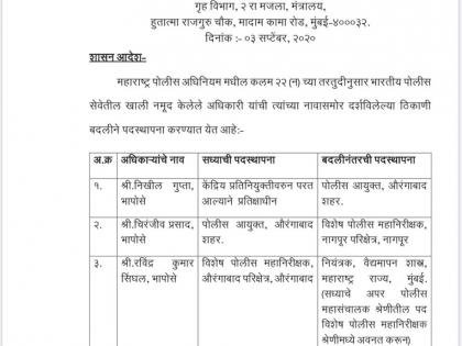 निखिल गुप्ता हे केंद्रीय नियुक्तीवरून राज्यात परतले आहेत. प्रसाद यांची बदली नागपूर परिक्षेत्राच्या विशेष पोलीस महानिरिक्षक पदी करण्यात आली आहे. तर तिसरे अधिकारी रविंद्र कुमार सिंघल यांची बदली नियंत्रक वैद्यमापन शास्त्र, मुंबई येथे करण्यात आली आहे. येथे ते विशेष पोलीस महानिरीक्षक समकक्ष पदावर काम पाहणार आहेत. सिंघल हे औरंगाबाद परिक्षेत्राचे विशेष पोलीस महानिरीक्षक होते.