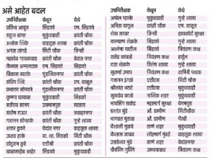 पोलीस आयुक्त डॉ. निखिल गुप्ता यांच्या आदेशाने या बदल्या करण्यात आल्या आहेत. सायबर पोलीस ठाण्याचा पदभार गौतम पातारे यांना देण्यात आला आहे. सहायक निरीक्षकांच्या बदलामध्ये गुन्हे शाखेचे सहायक निरीक्षक अजबसिंग जारवाल यांची बदली आर्थिक गुन्हे शाखेत केली आहे. आर्थिक गुन्हे शाखेचे अमोल सातोदरकर यांची सायबर, उपायुक्ताचे वाचक वामन बापुराव बेले यांची आयुक्तांचे जनसंपर्क अधिकारी, जवाहरनगर येथील श्रद्धा वायदंडे यांची सिडको, सिडकोचे शेषराव खटाणे यांची पुंडलिकनगर, क्रांतीचौक येथील शांतीलाल राठोड यांची वाहतूक शाखा, राहुल सूर्यतळ यांची क्रांती चौक येथून उस्मानपुरा, घनश्याम सोनवणे यांची पुंडलिकनगर येथून विशेष शाखा, वनिता चौधरी यांची मुकुंदवाडीतून जवाहरनगर, नितीन कामे यांची हर्सुल येथून क्रांतीचौक, पंकज बारवाल यांची उस्मानपुरा येथून वाहतूक शाखेत, रामेश्वर चव्हाण यांची वाचक कक्षातून एएचटीयू कक्षात, अमोल ढोले यांचे एएचटीयूमधून पोलीस आयुक्ताचे वाचक म्हणून बदली केली आहे. याशिवाय शहराबाहेरुन आयुक्तालयात आलेले सहायक निरीक्षक अनिल मगरे यांची जिन्सी, प्रभू ठाकरे यांची वाहतूक शाखा आणि सुधीर वाघ यांची जवाहरनगर येथे नेमणूक करण्यात आली आहे.