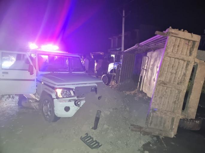 पैठण ( औरंगाबाद ) : पैठण तहसीलच्या गौण खनिज प्रतिबंधक पथकाच्या शासकीय जीपला धडक मारून पळून जाण्याच्या प्रयत्नात अवैध मुरमाची वाहतूक करणाऱ्या ट्रक्टरची ट्रॉली जीपवर पलटी झाल्याने जीपचे मोठे नुकसान झाले. पथकातील कर्मचारी जीपमधून खाली उतरलेले असल्याने या घटनेत जीवीतहानी झाली नाही. सोमवारी रात्री ९ वाजेच्या दरम्यान ही थरारक घटना घडली असून अंधाराचा फायदा घेत ट्रॅक्टर चालक तेथून पसार झाला. या प्रकरणी रात्री पैठण पोलीस ठाण्यात गुन्हा नोंदविण्याची कारवाई सुरू होती.
