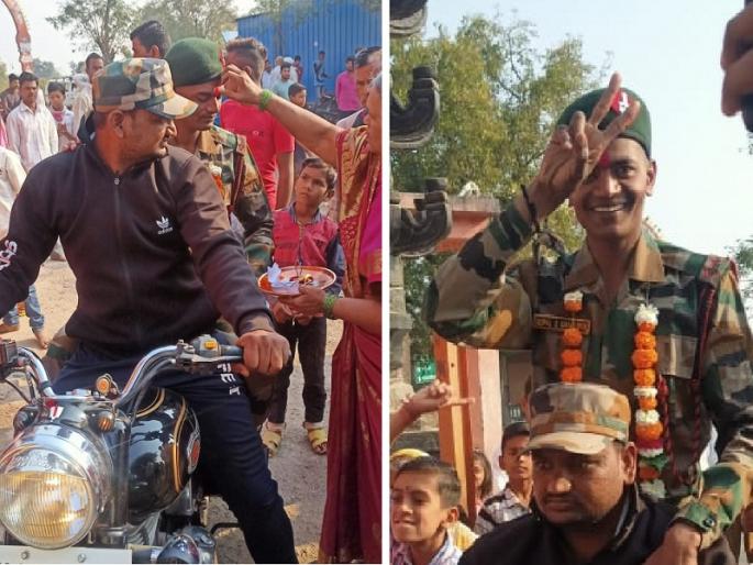 सोयगाव येथील गोपाल श्रावण गांगुर्डे असं जवानाचं नाव आहे. दीड वर्षांपूर्वी गोपाल गांगुर्डे यांची भारतीय लष्करात आसाम रायफल्समध्ये हवालदार (क्लार्क) पदी निवड झाली होती. सध्या ते मणिपूर येथे कर्तव्य बजावत आहेत. प्रशिक्षण पूर्ण करून सुट्टीनिमित्त गावात आल्यानंतर आई व नातलग महिलांनी औक्षण केले. गावकरी व मित्र मंडळाने गोपालयाचे जंगी स्वागत करत, संगीताच्या ठेक्यावर ताल धरत स्वागत केले. हे सर्व पाहून जवान गोपाल गांगुर्डे भारावून गेले होते. गावकऱ्यांचे प्रेम पाहून त्यांच्या डोळ्यांच्या कडा पाणावल्या.