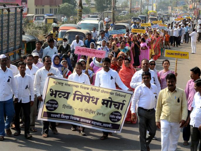 शालेय शिक्षण विभागाच्या चट्टोपाध्याय व निवड श्रेणी संदर्भातील शासन निर्णय मागे घेण्यात यावा, शिक्षकांसह कर्मचाºयांना जुनी पेन्शन योजना लागू करावी, मुख्याध्यापक व शिक्षकांकडे असलेली सर्व आॅनलाईन कामे काढून घ्यावीत, एमएससीआयटीस २०१८ पर्यंत मुदतवाढ द्यावी तसेच शासनस्तरावर शिक्षकांच्या प्रलंबित प्रश्नांची तात्काळ सोडवणूक करण्यात यावी, यासह अन्य मागण्यांसाठी परभणी जिल्हा शिक्षक समन्वय महासंघाच्या वतीने शनिवारी जिंतूर रोडवरील ज्ञानोपासक महाविद्यालयाच्या मैदानावरून काळ्या फिती लावून शासनाचा निषेध करीत मोर्चा काढण्यात आला़ हा मोर्चा उड्डाणपुलावरून बसस्थानक, रेल्वेस्थानक, डॉ़ बाबासाहेब आंबेडकर यांच्या पुतळ्यामार्गे जिल्हा कचेरीवर नेण्यात आला़ या मोर्चा दरम्यान शिक्षकांनी शासनाच्या धोरणाविरूद्ध तीव्र नाराजी व्यक्त करीत घोषणाबाजी केली़ या मोर्चात राम लोहट, ज्ञानेश्वर लोंढे, किशन इदगे, मधुकर कदम, डॉ़ दिलीप श्रृंगारपुतळे, सोपान बने, भगवान पारवे, माधवराव सोनवणे, शेख नूर, शंकर खिस्ते, विलास भालेराव, सतीश कांबळे, ए़डी़ जल्हारे, सुशील काकडे, सायस चिलगर, उज्ज्वला जाधव, सविता चव्हाण, बाळासाहेब यादव, एस़एस़ भिसे आदींचा सहभाग होता़ दरम्यान महासंघाच्या वतीने जिल्हाधिकाºयांना मागण्यांचे निवेदन सादर करण्यात आले़