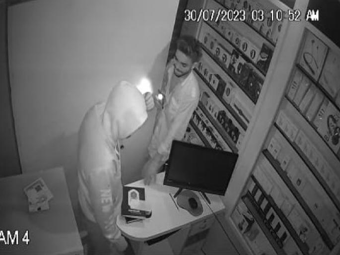 चोरटे सीसीटीव्ही कैददरम्यान, मोबाईल शॉपीमध्ये शिरल्यानंतर दोन चोरटे आतमधील सीसीटीव्हीमध्ये कैद झाले आहेत. हे चोरटे अर्धा तासापेक्षा अधिक वेळ मोबाईल शॉपीमध्ये सामानाची शोधाशोध करीत होते.