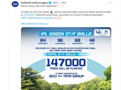 नवी दिल्ली : आयपीएल २०२३ मधून पर्यावरणाचा संदेश देण्यासाठी आणि पर्यावरणाचे रक्षण करण्यासाठी बीसीसीआय आणि टाटा समूहाने संयुक्तपणे पुढाकार घेतला आहे. आयपीएलच्या प्लेऑफमध्ये आणि फायनलच्या सामन्यात टाकलेल्या एका डॉट बॉलमागे पाचशे झाडे लावली जातील, हा उपक्रम राबवला जात आहे. बीसीसीआयने याची माहिती दिली असून TATA IPL च्या प्लेऑफ आणि फायनलमध्ये २९४ निर्धाव चेंडू टाकण्यात आले. त्यामुळे आता तब्बल १,४७,००० झाडे लावली जाणार आहेत.